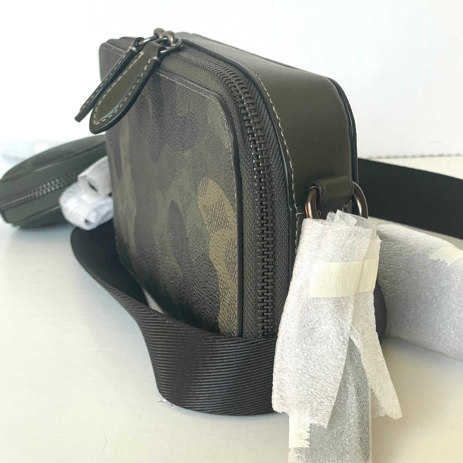 Stylish and versatile Coach Charter crossbody crafted of refined leather and Signature Camo print coated canvas. Compact design with one main compartment and a detachable round zip pouch for small essentials. Can be used as a crossbody, small messenger, or pouch inside a larger bag—perfect for travel, commuting, or everyday use.