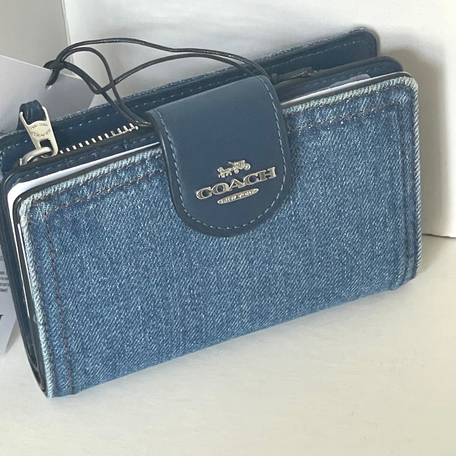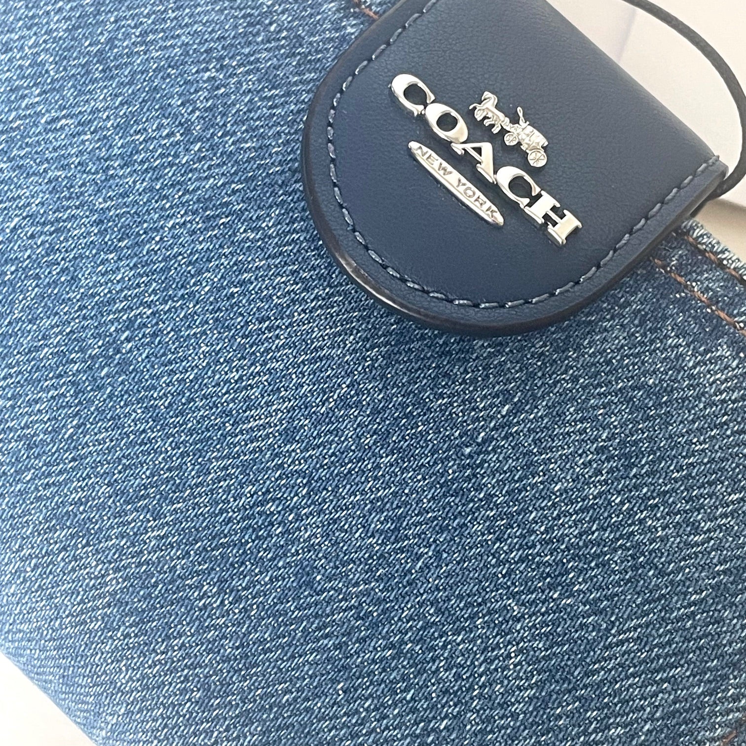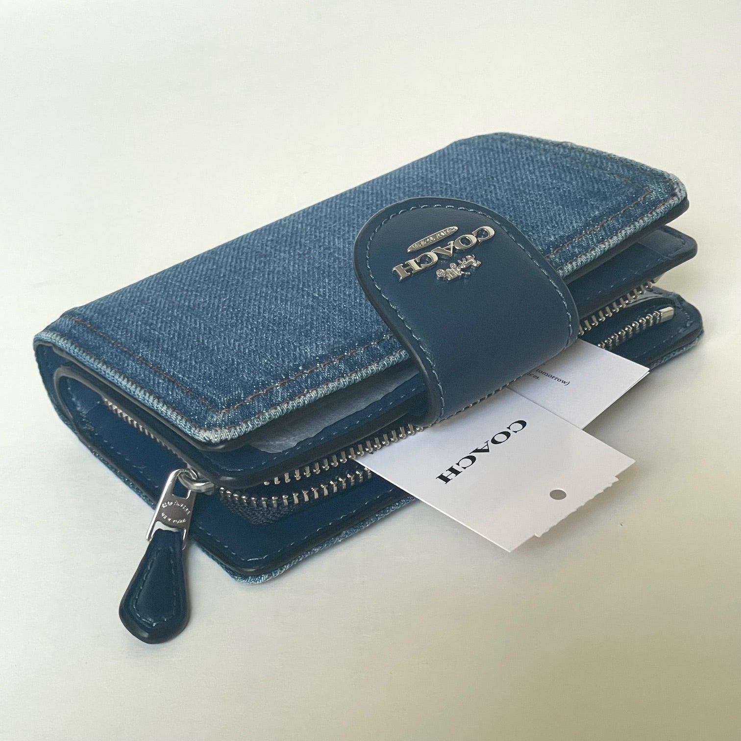 This Coach Medium Corner Zip Wallet in denim is the perfect everyday companion—compact yet surprisingly spacious. Designed for easy organization, it features seven card slots, a bill compartment, a zip coin pocket, and a secure snap closure. Despite its size, it can hold essentials like keys, a card case, and even an iPhone up to the 15 Pro Max. Durable and stylish, this wallet combines functionality with classic Coach design, making it a piece you’ll reach for again and again..