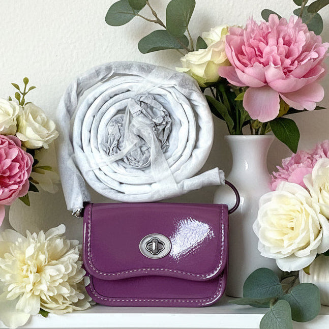 Made for change: the Wavy Wallet is a mini wallet with a removable shoulder strap and turnlock partially made with recycled acrylic plastic—not just splendidly swervy but perfectly sized for carrying coins, notes and cards. Sleek and shiny, this version comes in crinkle patent Coachtopia leather (crafted with at least 50% recycled fibers from leather scraps).