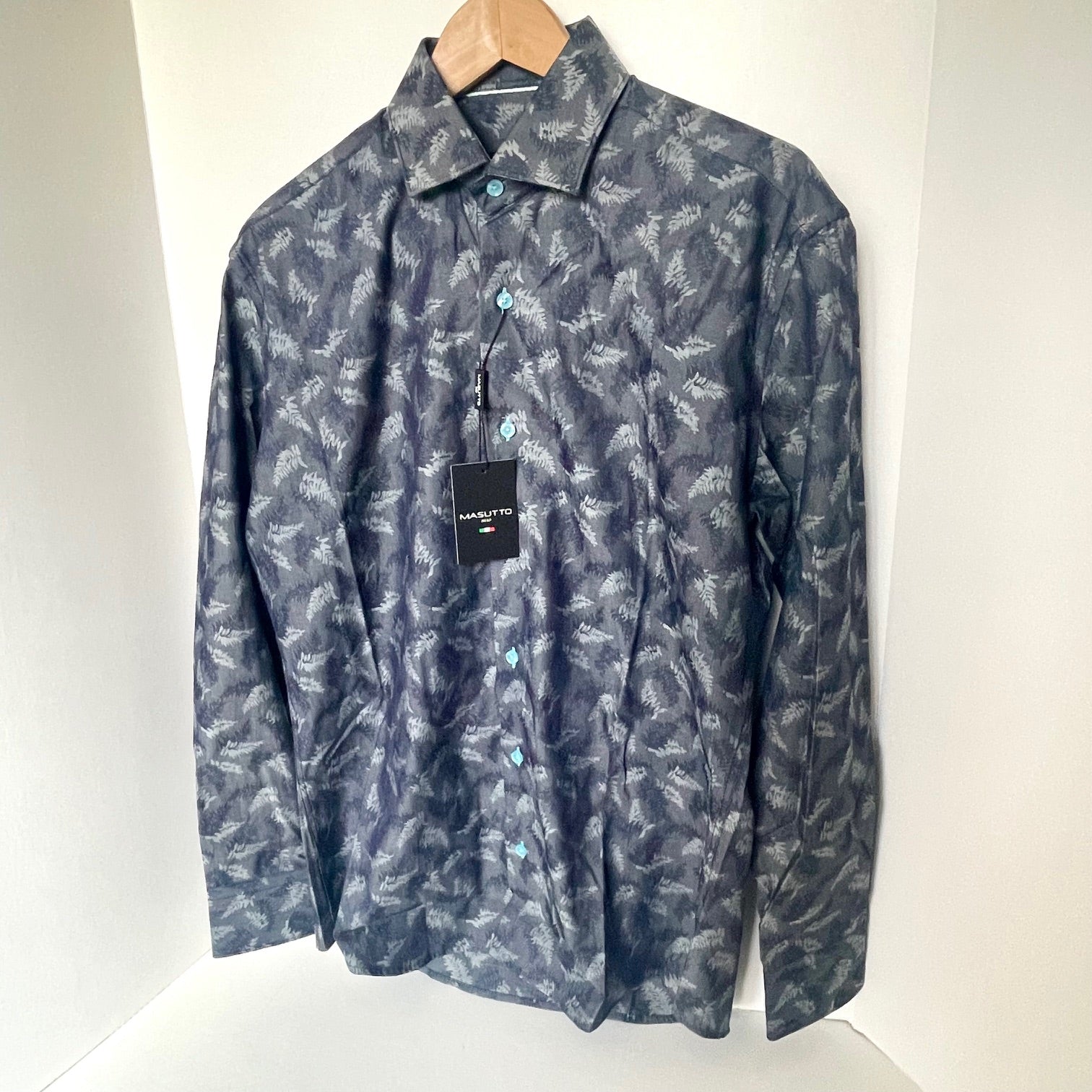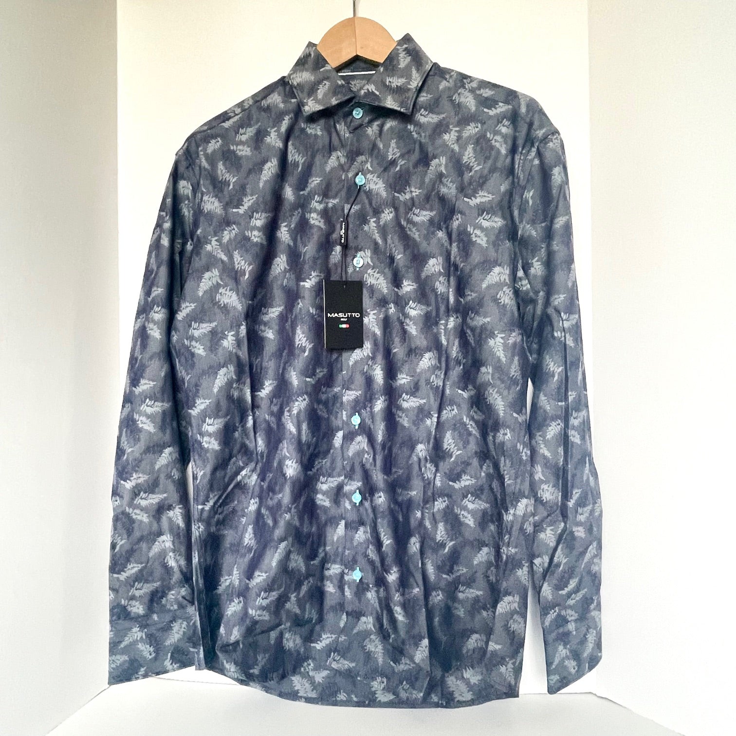 An abstract leaf print enlivens this crisp cotton semi Fitted button-down shirt. Detailed with contrast blue buttons, a look for the modern man.