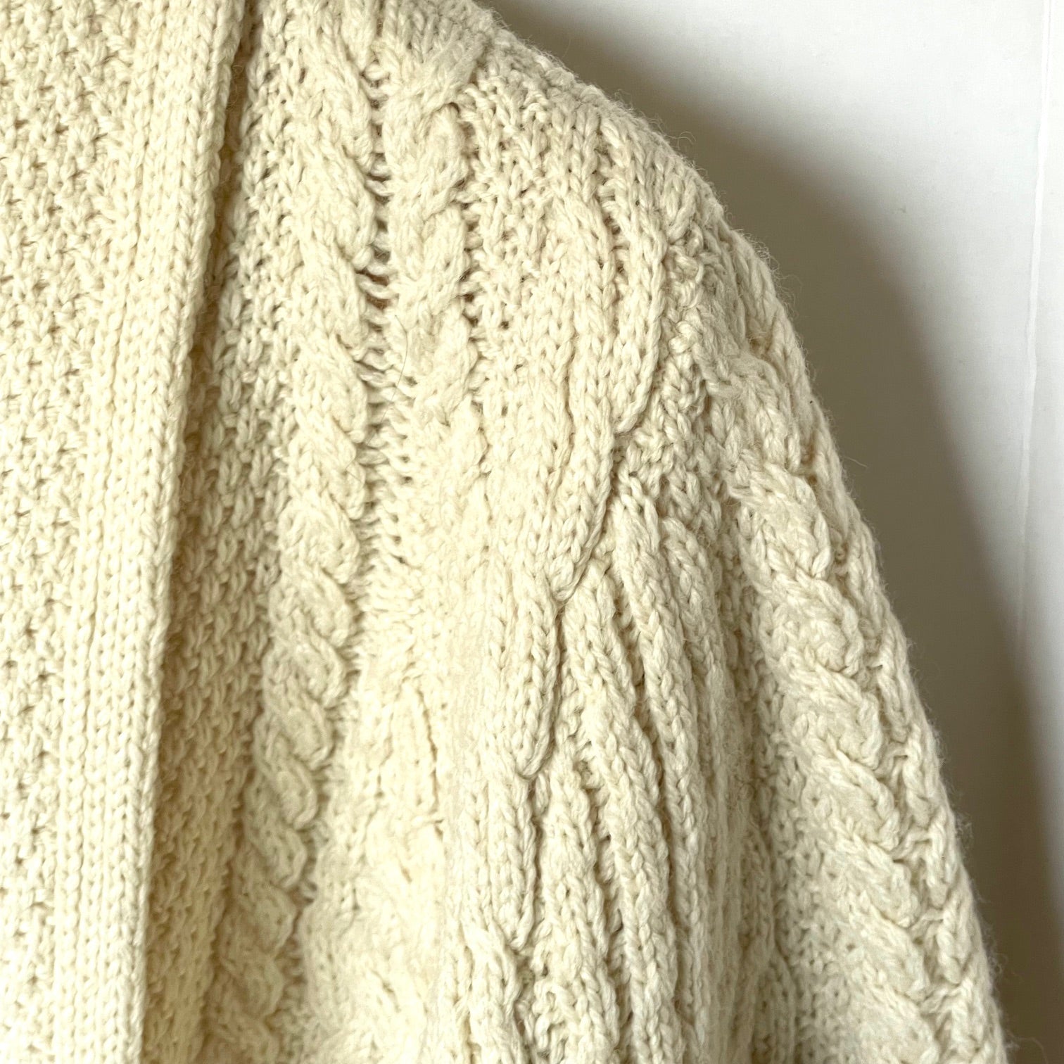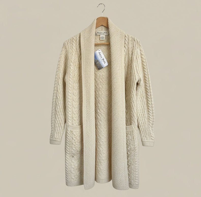 Aran's Edge to edge Shawl collar cardigan coat featuring beautifully detailed Aran stitches, super soft merino wool, and a classic waterfall design for timeless comfort, warmth, and effortless layering style.