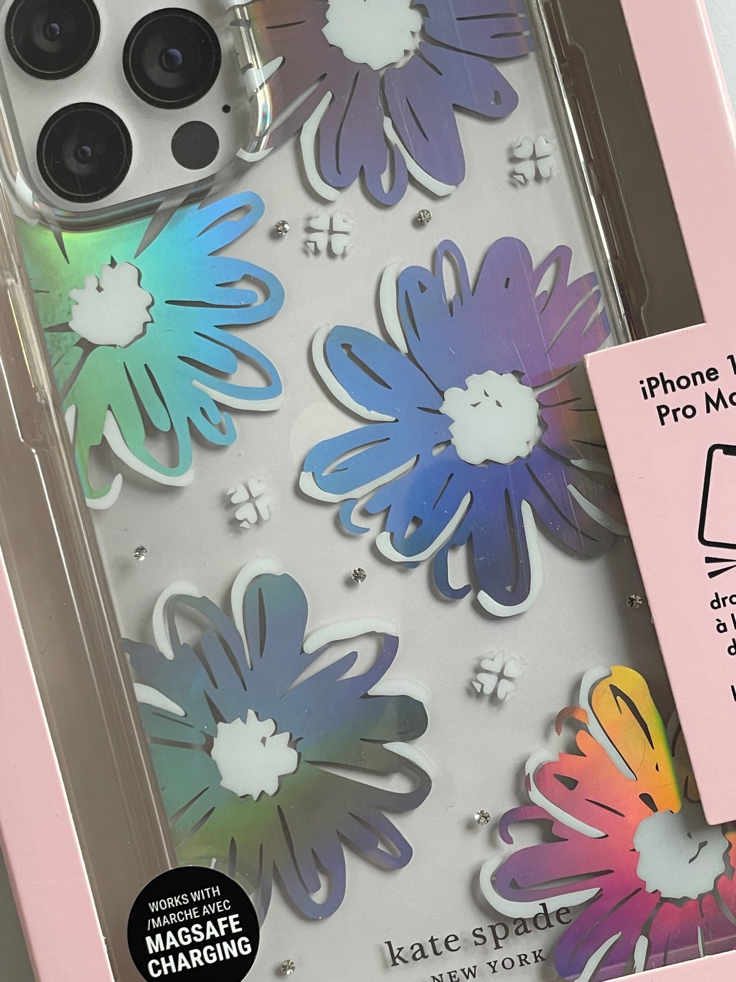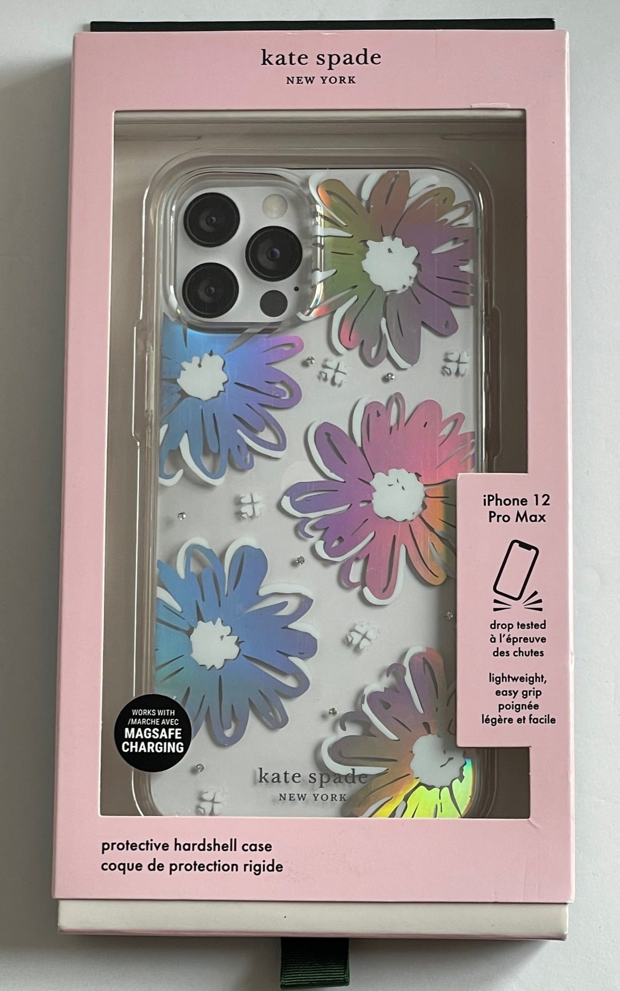 The Kate Spade New York Defensive Hardshell Case for Apple iPhone 12 Pro Max Smartphones. Daisy Floral pattern with Iridescent Highlight on a clear shell with white border trim..