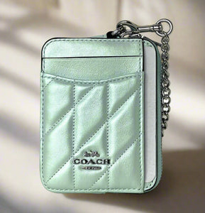 Coach CBL77 Quilted Zip Card Case Pearlized Leather ID Wallet Chain Strap ORGPKG