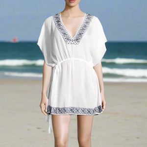 Joie Tunic Beach Dress Coverup M/L White V-Neck Blue Embroidered Cotton