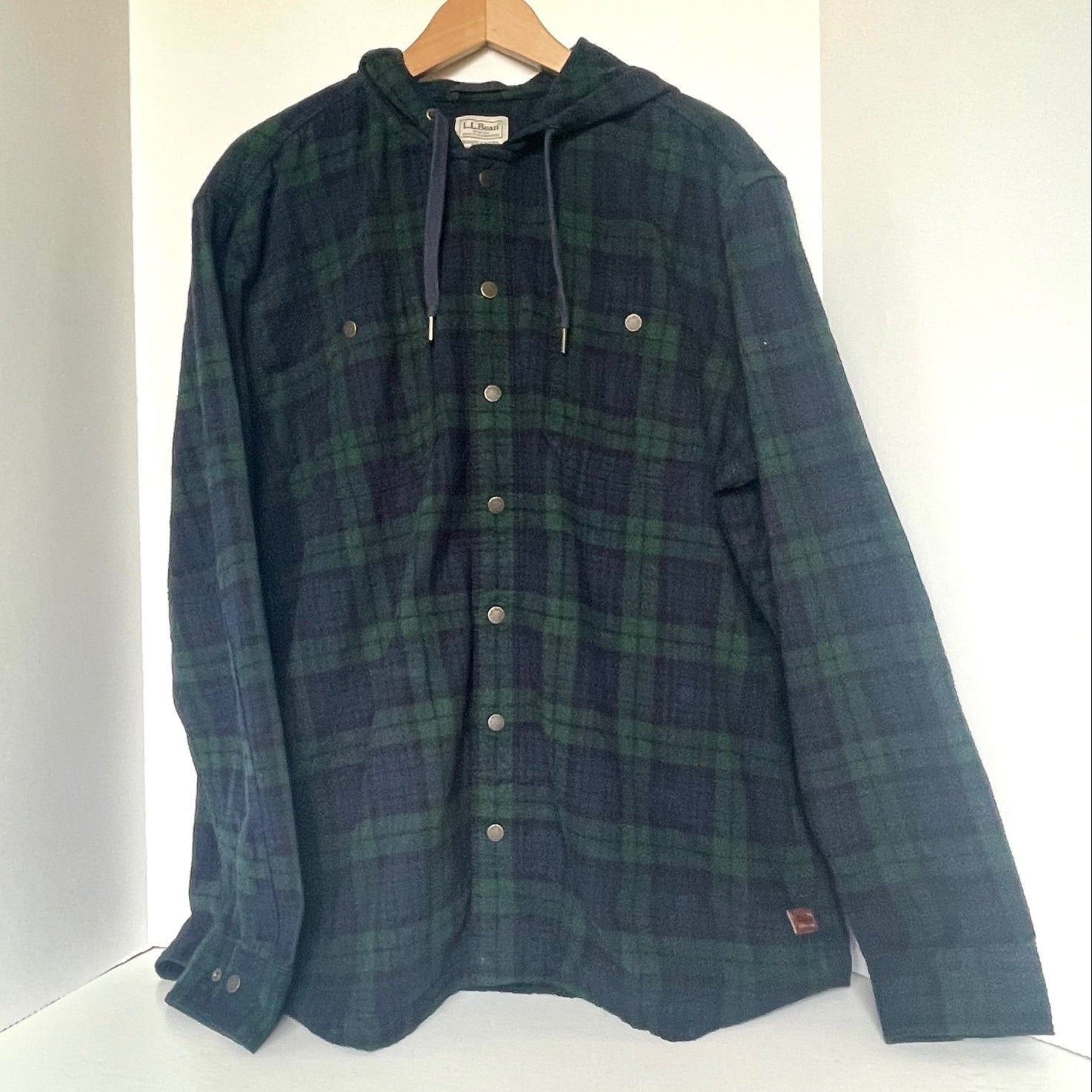 LL Bean Men's XL Scotch Plaid Flannel Hooded Shirt Slightly Fitted Green Black NWT