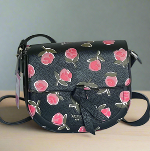 Kate Spade Knott Ditsy Rose Crossbody Black Leather Floral Saddle Bag Small