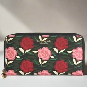 Kate Spade Morgan Large Continental Wallet Black Pink Floral Roses Zip Around