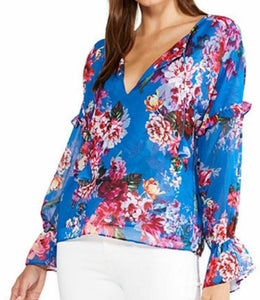 MISA Shirt Womens Extra Large Blue V-Neck Floral Long Sleeve Capriana Top
