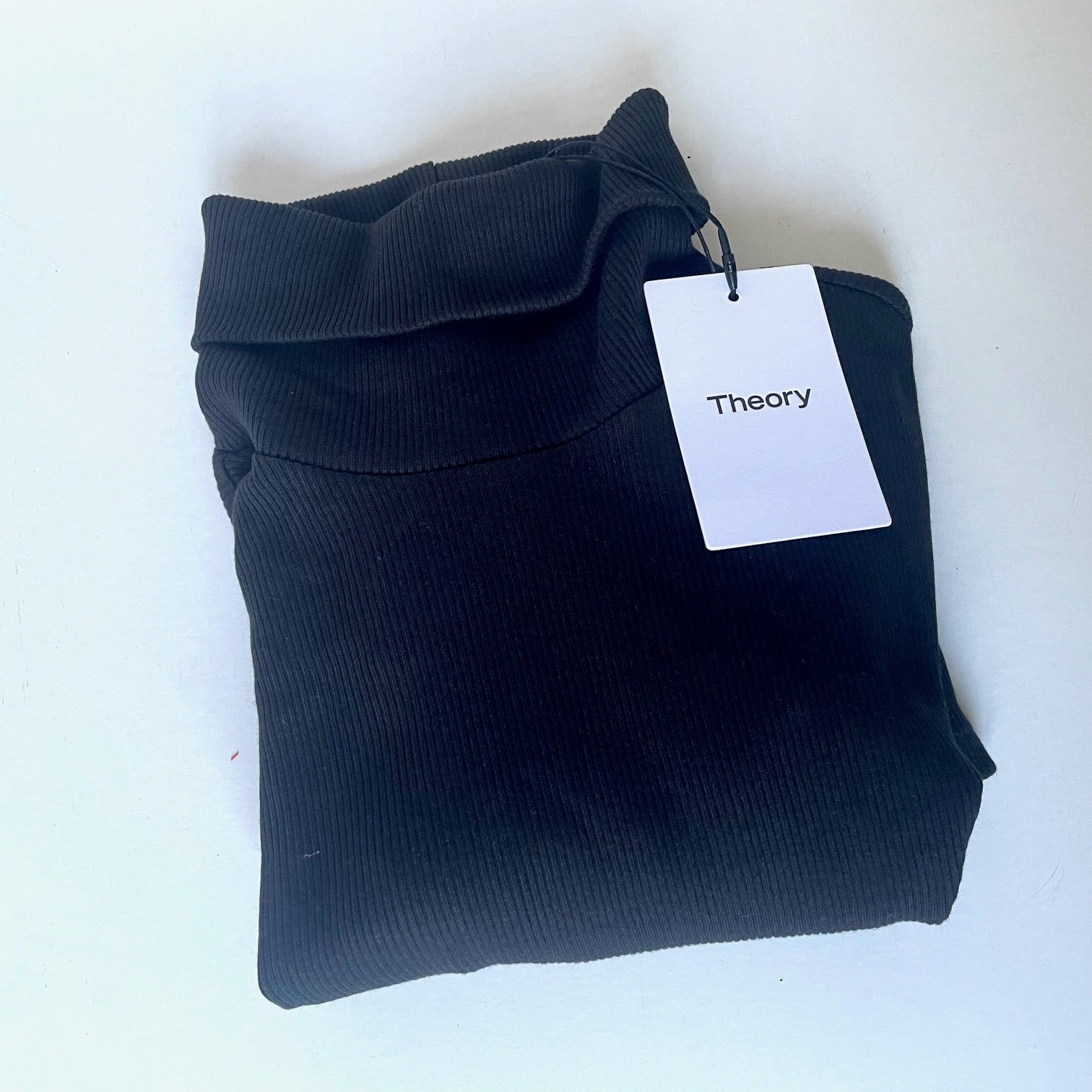 Folded black garment with a 'Theory' tag on a white background