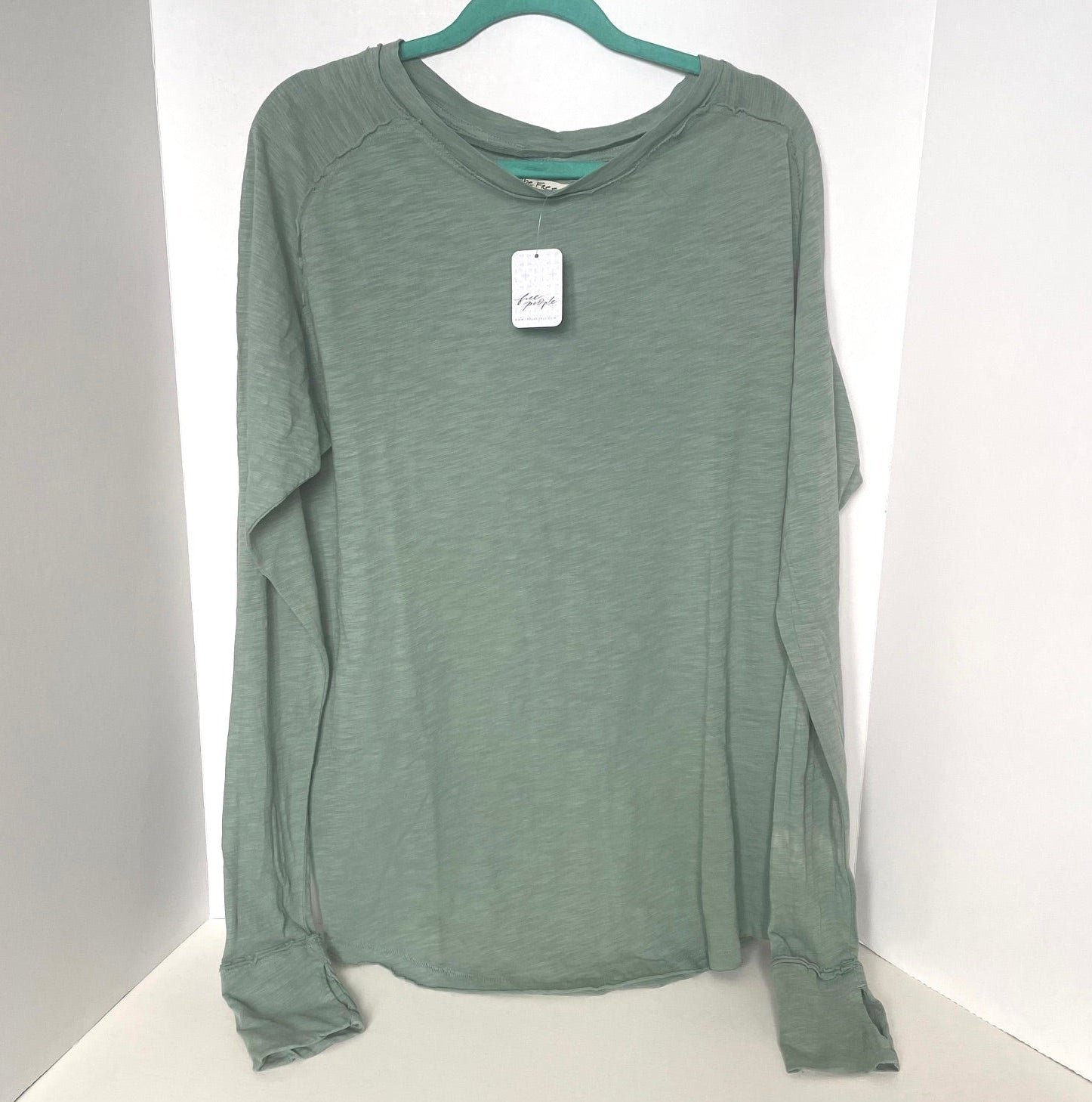 Green long-sleeve shirt on a hanger with a white background