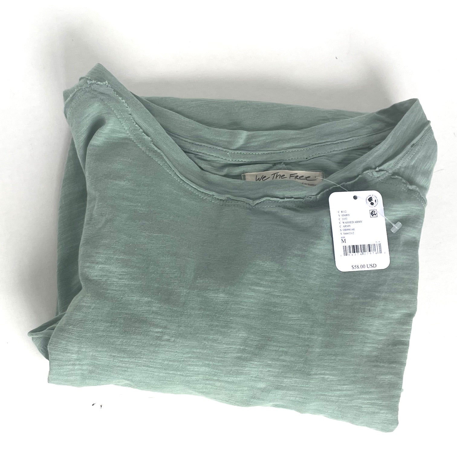 Folded green shirt with a tag on a white background