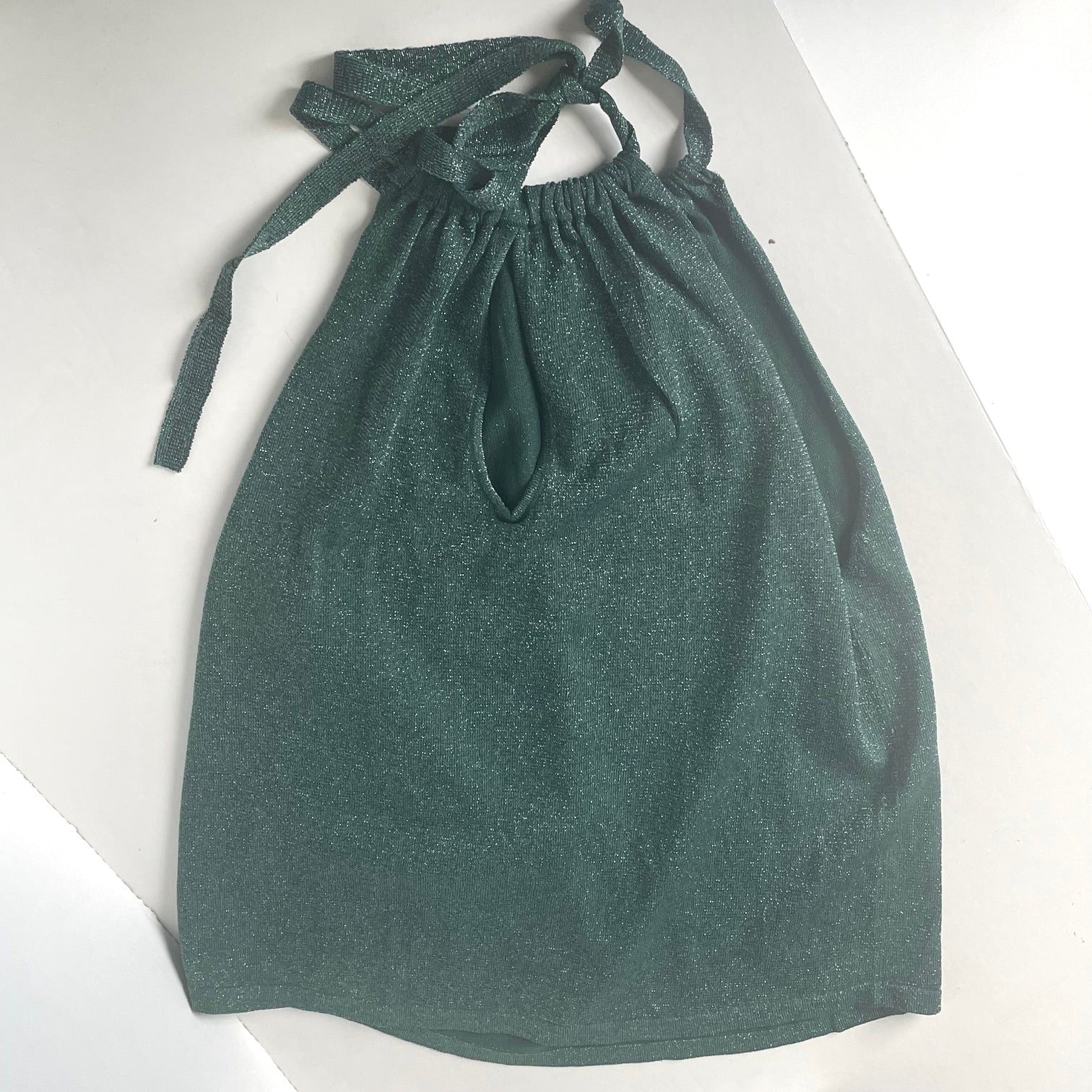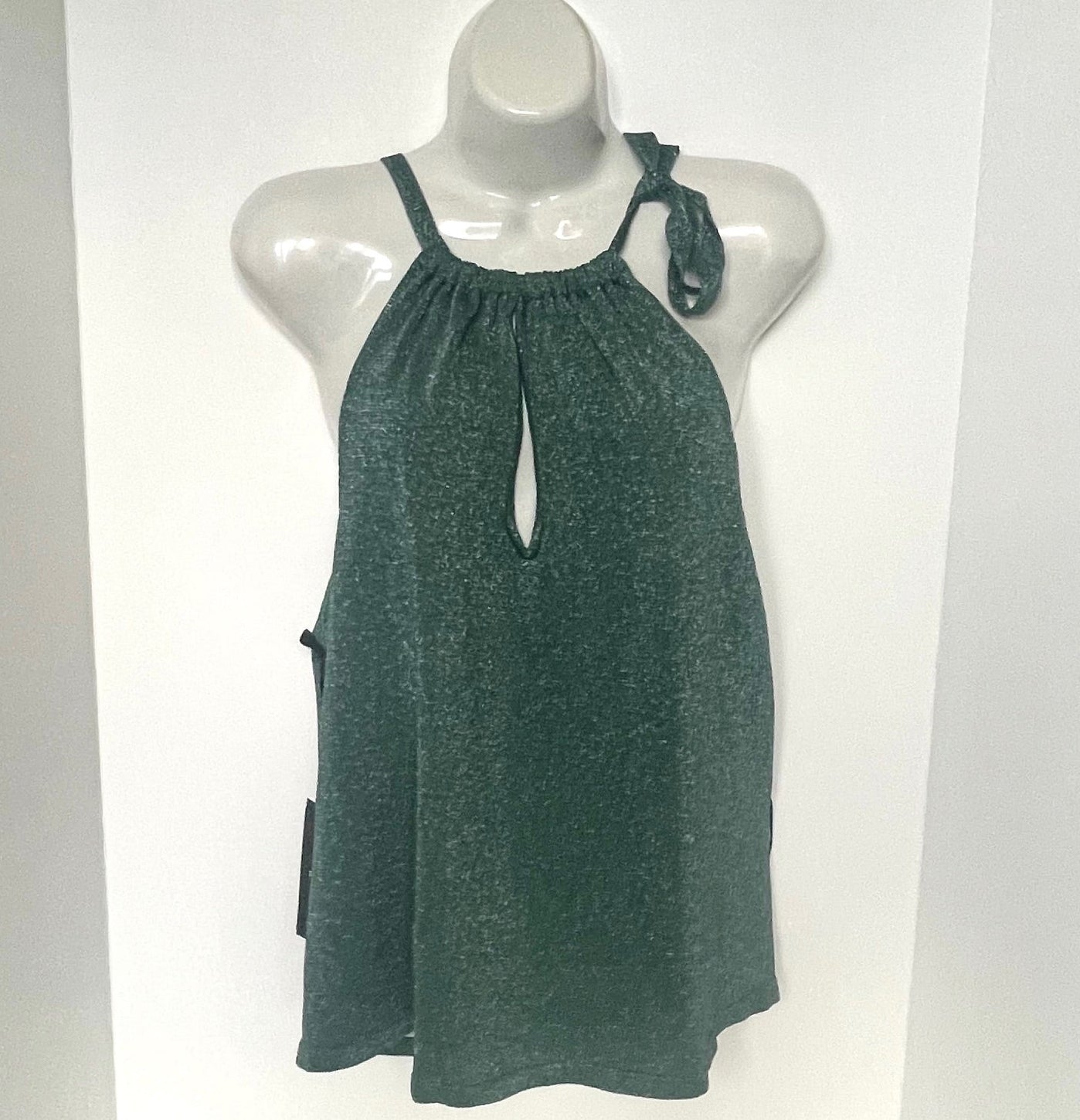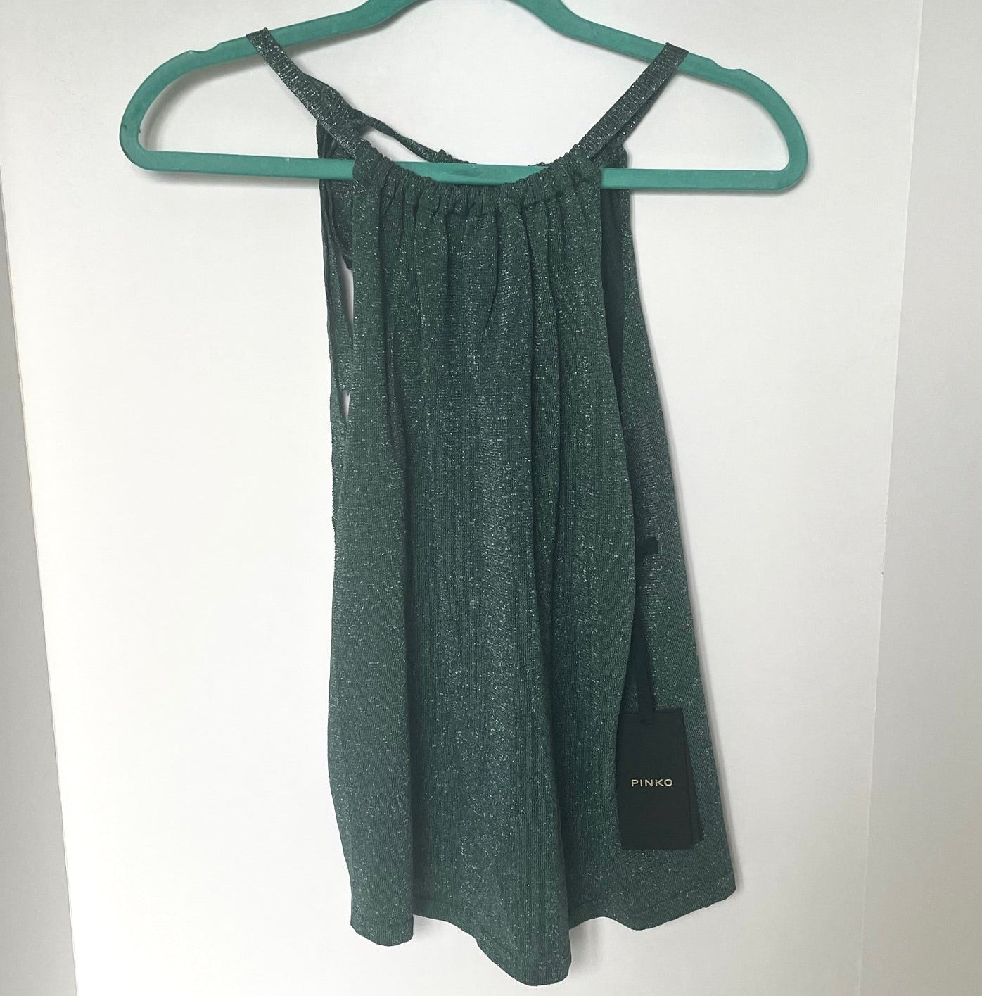 Pinko Valdemoro lurex knit halter top in metallic green. Clean sleeveless silhouette with subtle shimmer. Italian designer women’s top, size Small..