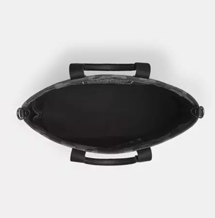 Crafted in durable canvas and smooth leather, the Tote 38 carry-all bag's features a modern aesthetic with a bold Camo print, has a spacious design, top zip closure and optional crossbody strap.