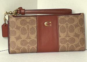 Coach Double Zip Wallet Wristlet Brown Leather Signature Canvas Slim CC965