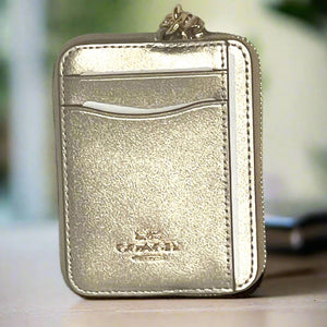 Coach Champagne Gold Zip Card Case CW890 ID Wallet Leather Chain Strap