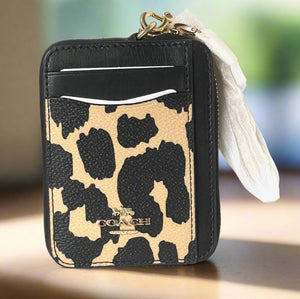 Coach Leopard Zip Card Case ID Wallet Brown Leather Canvas Chain Strap CW884