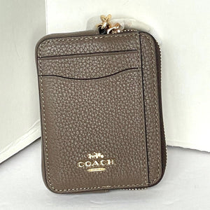 Coach Zip Card Case 6303 ID Wallet Dark Stone Pebbled Leather Chain Strap