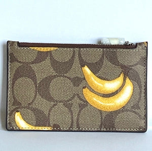 Coach Zip Card Case Banana Print Brown Leather Wallet CR410 Signature Canvas