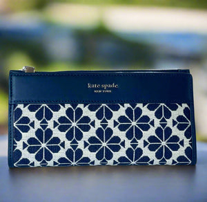 Kate Spade Flower Jacquard Zip Slim Wallet Blue Bifold Snap Leather Medium