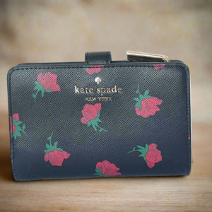 Kate Spade Madison Medium Compact Wallet Women Black Rose Toss Bifold Floral
