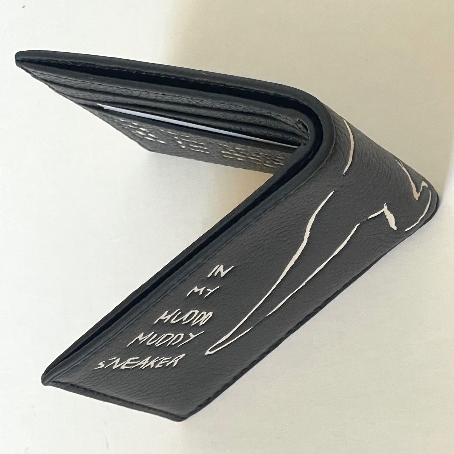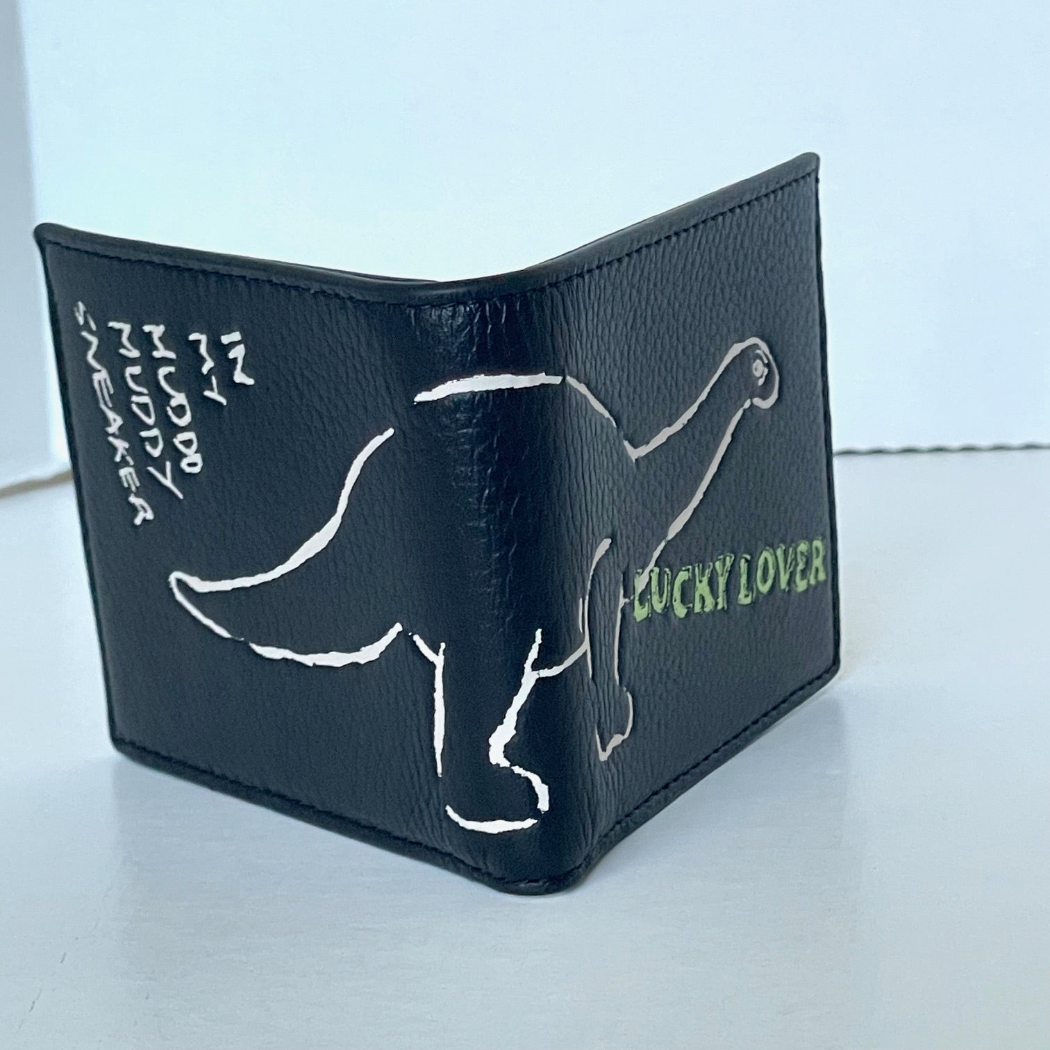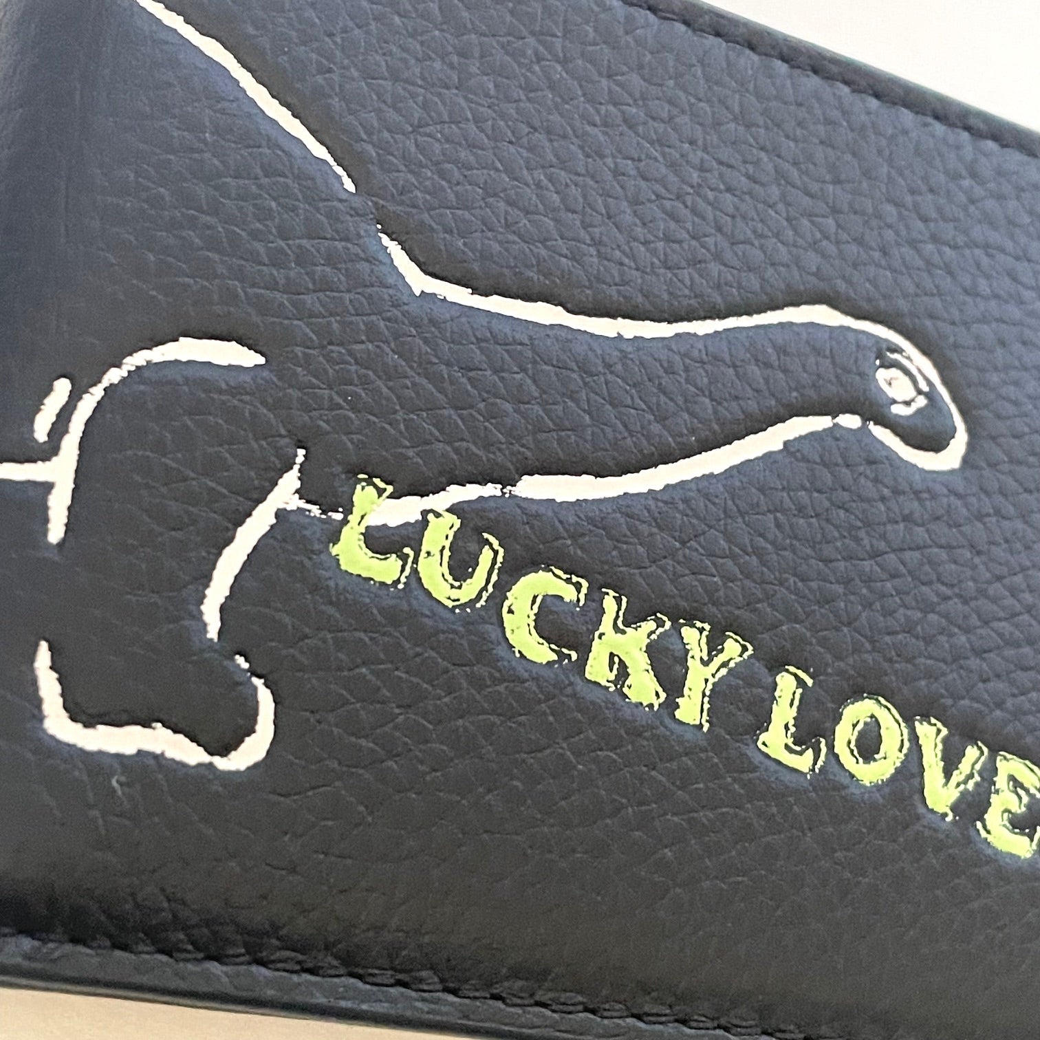 Black leather wallet with 'Lucky Lover' embroidery on a light background