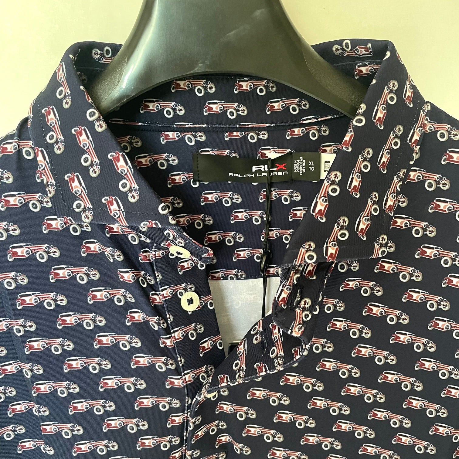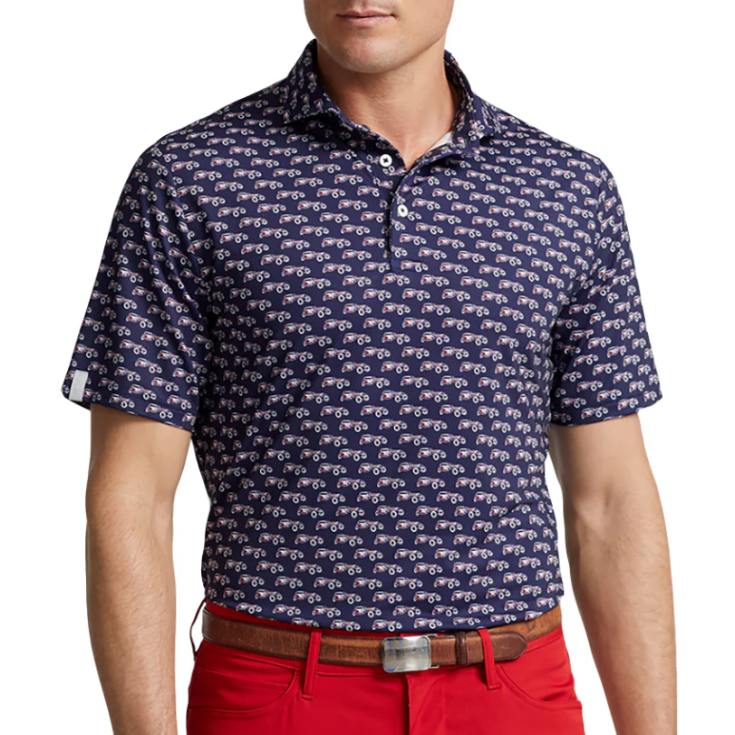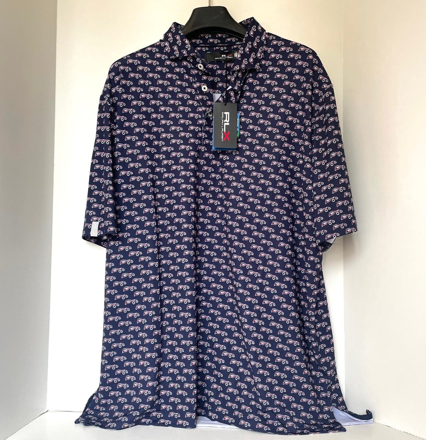 RLX Polo Golf Airflow Polo Shirt Men’s XL Blue Navy Cars Print Short Sleeve Classic Fit