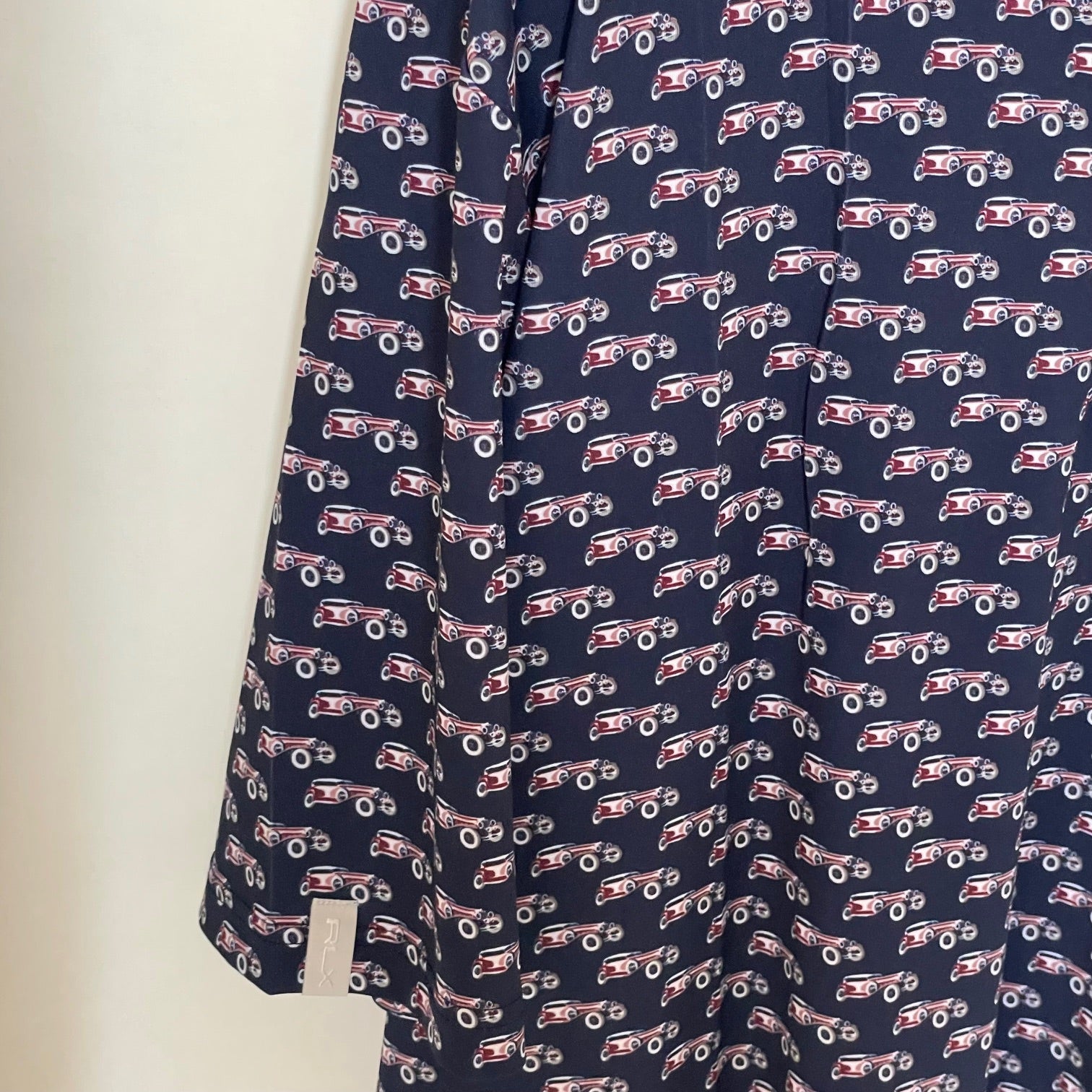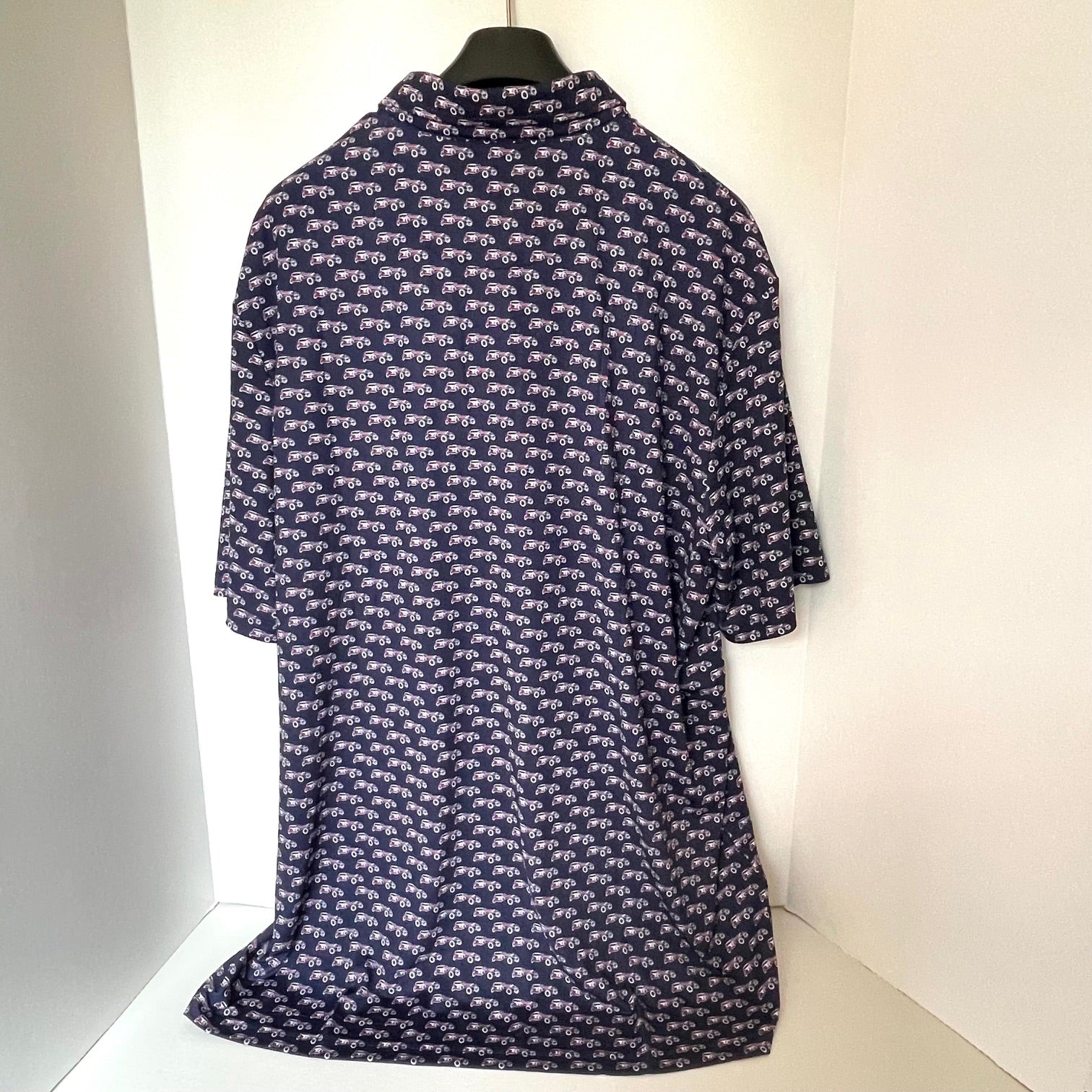 Navy shirt with vintage car pattern on a mannequin against a white background