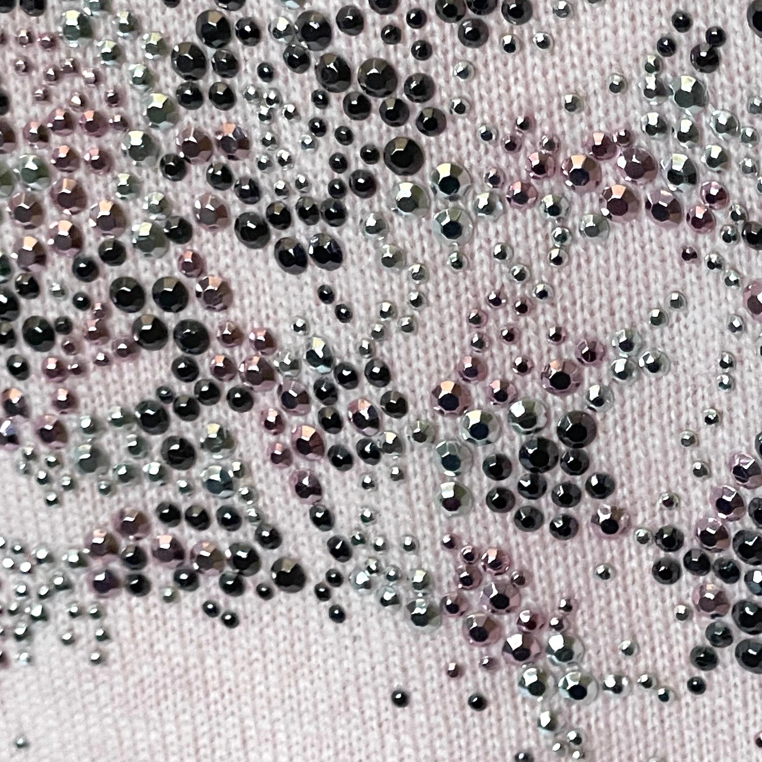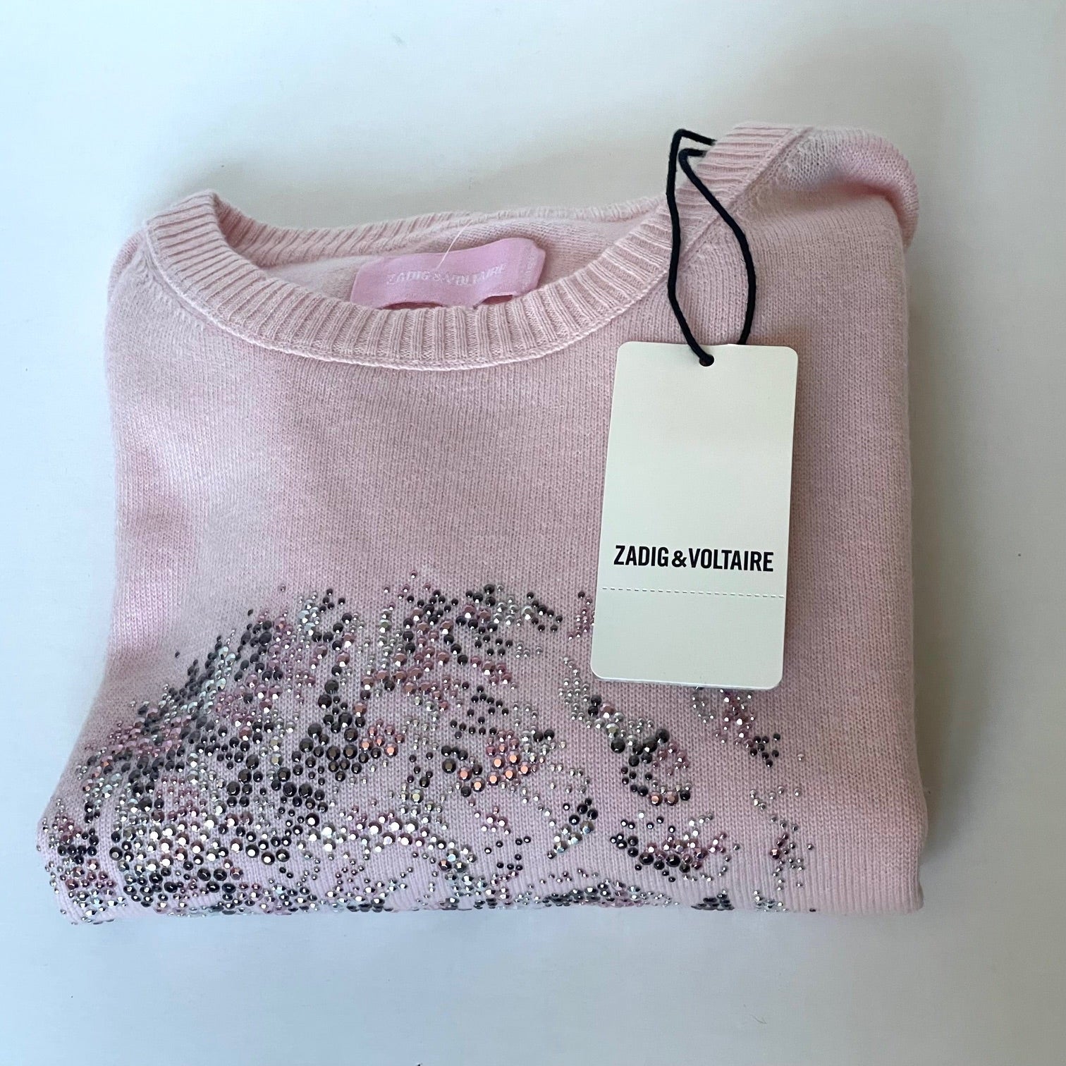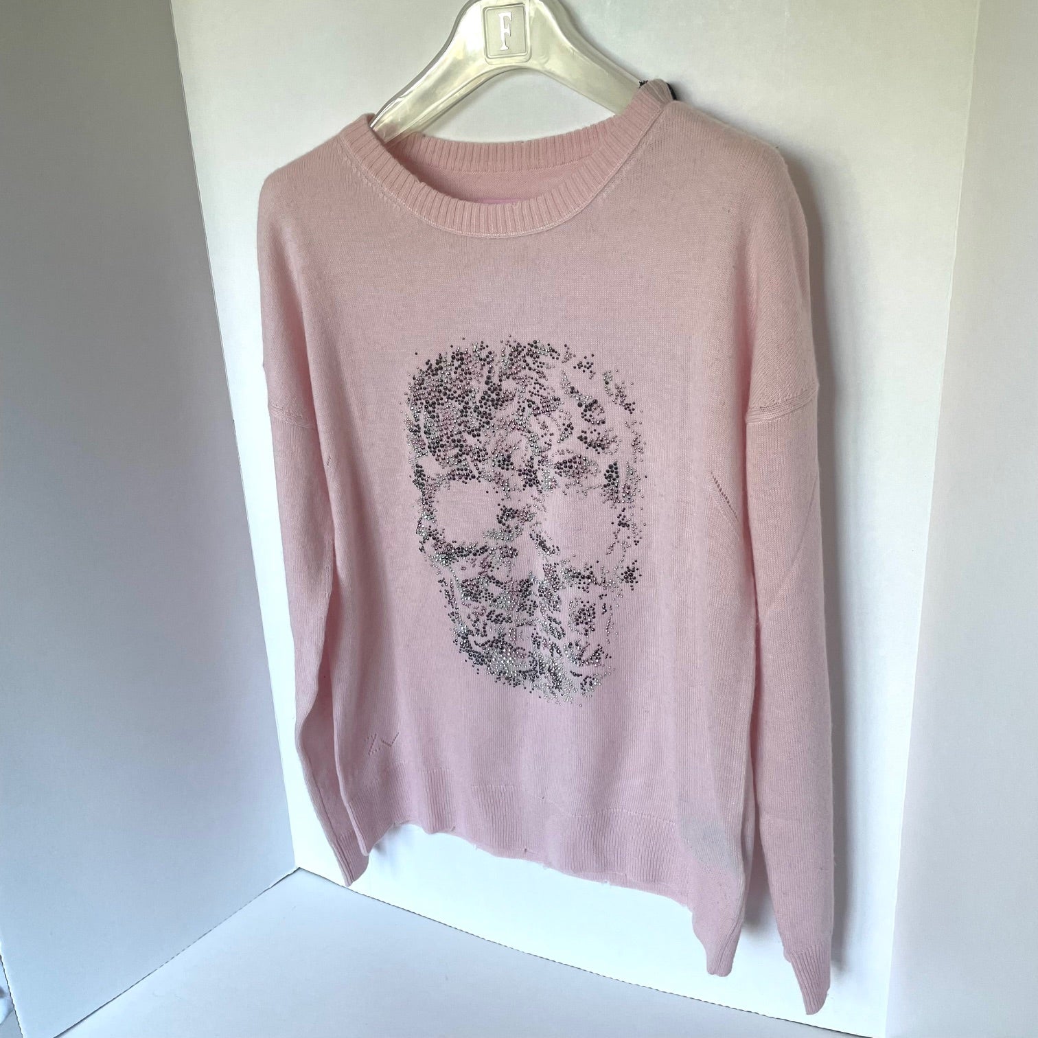 Zadig & Voltaire women’s pink round-neck wool cashmere sweater with dropped shoulders and embelished strass skull pattern on front.