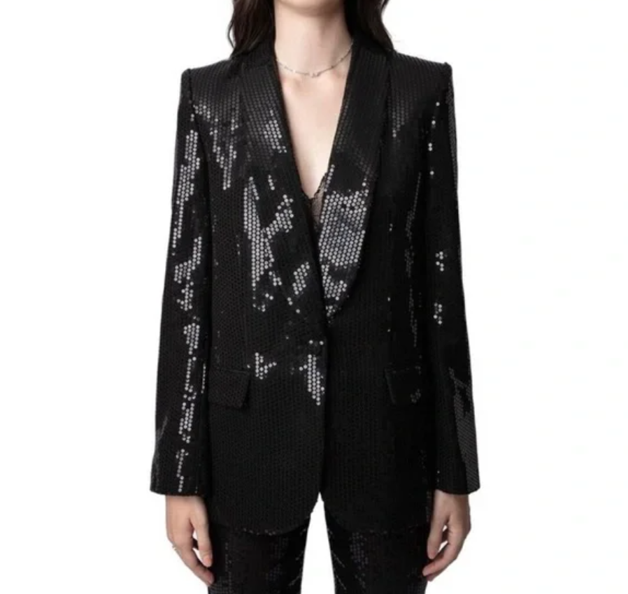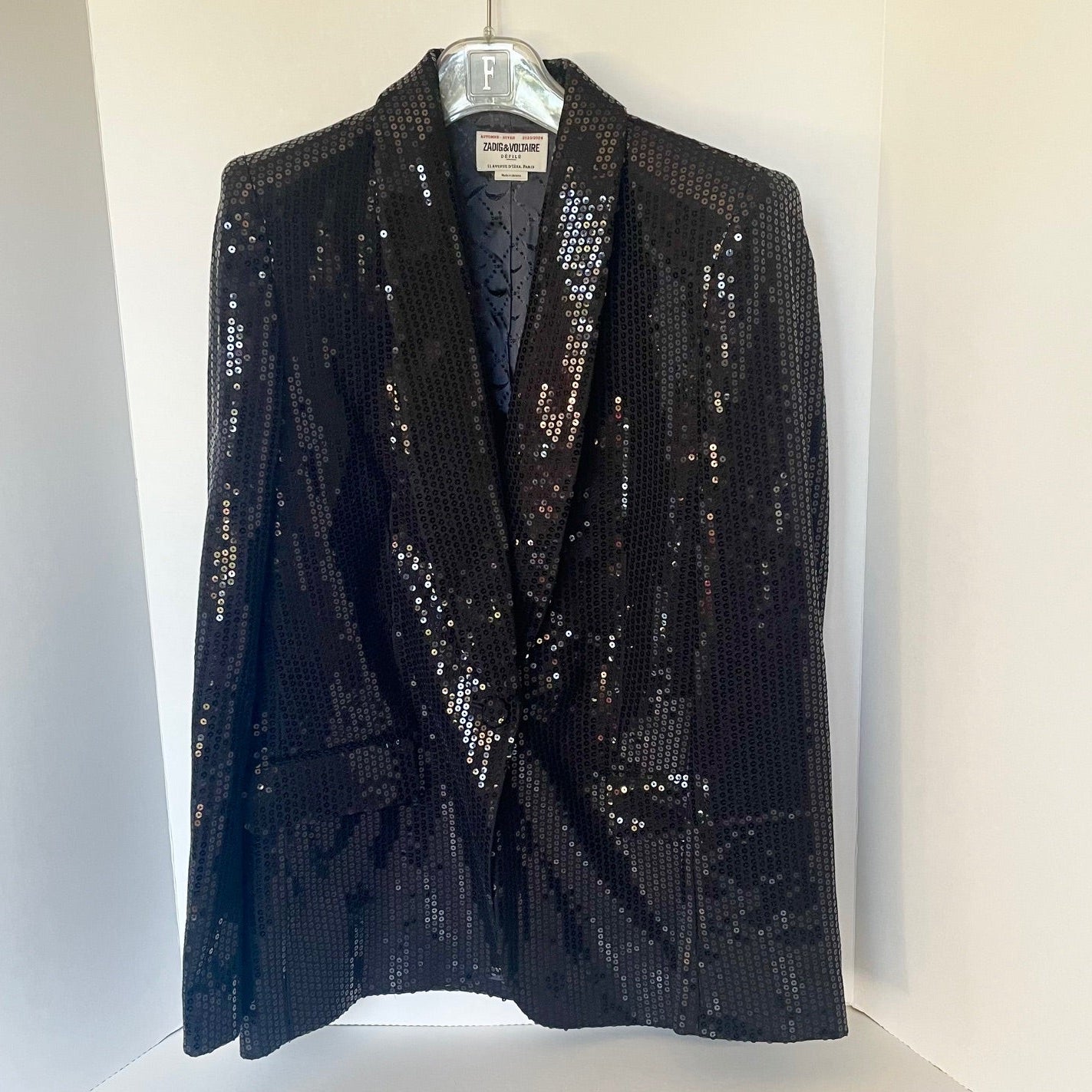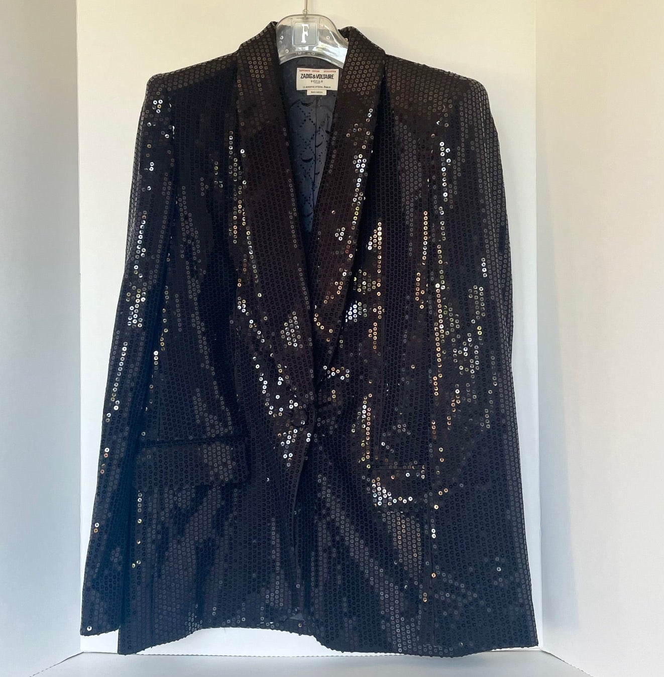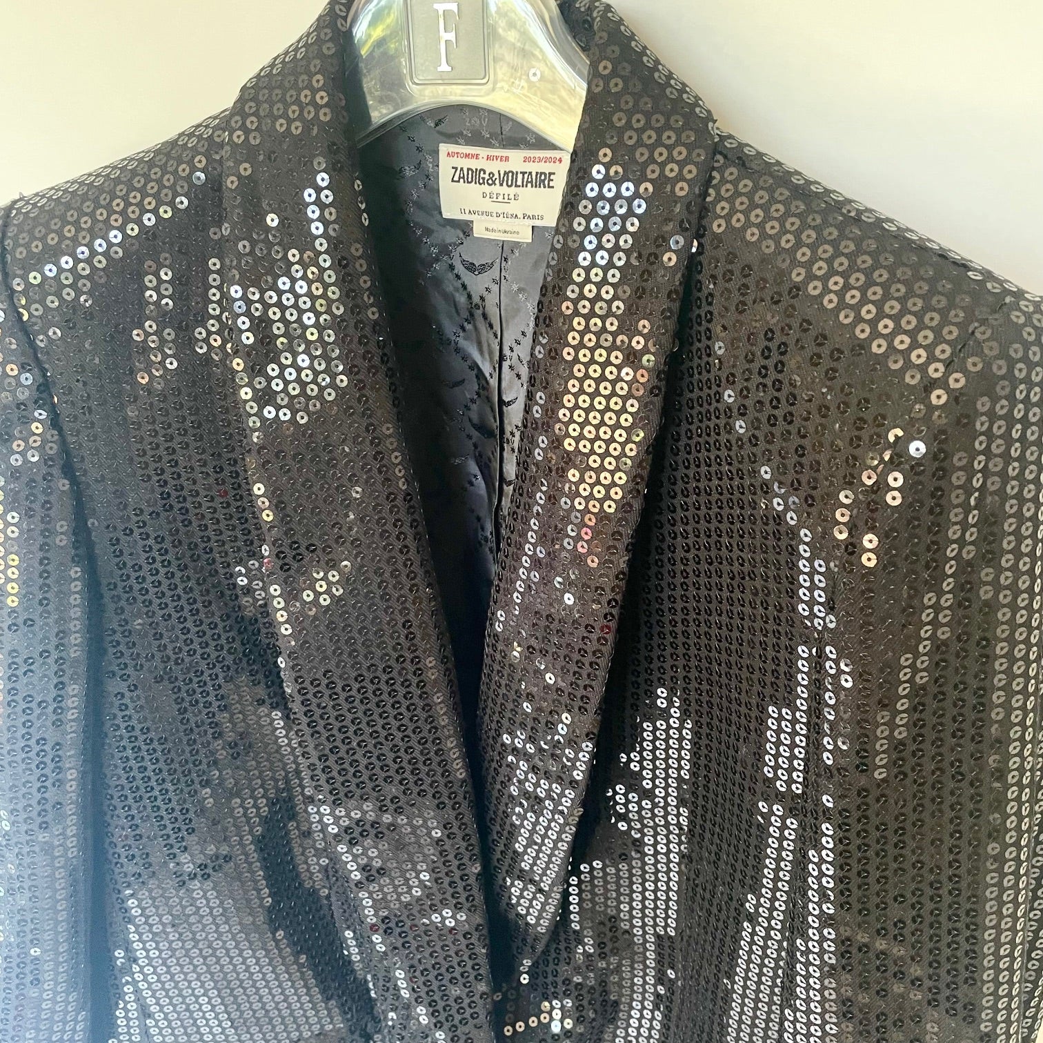 Make a sparkling entrance at your next soirée in this stunning Zadig & Voltaire Vive Sequin Blazer. This elegant tuxedo-inspired jacket catches the light beautifully, while its tailored silhouette and luxurious jacquard-woven lining add a refined finishing touch. Perfect for evening events, parties, or elevating a classic look with a hint of glamour.